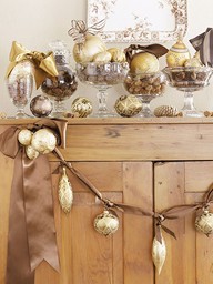 6- Dourados e castanhos.Um móvel de madeira ganha requinte com bolas, pinhões e um cordão de fita com adornos .